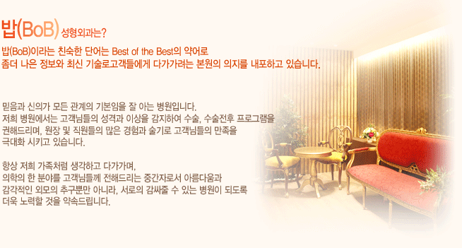 3호선 압구정역 4번출구나오자마자 우측길로 들어와 처음사거리에서 좌측으로(청박병원 끼고) 1분정도 쭉오시면 우측에 밥 성형외과 간판이 보입니다.