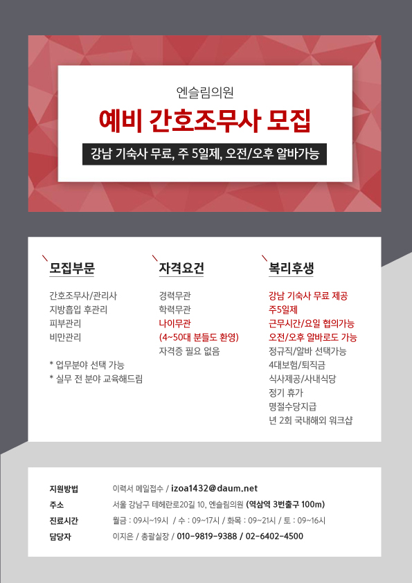 | (강남기숙사무료제공)피부관리선생님/예비간호조무사선생님모집 |